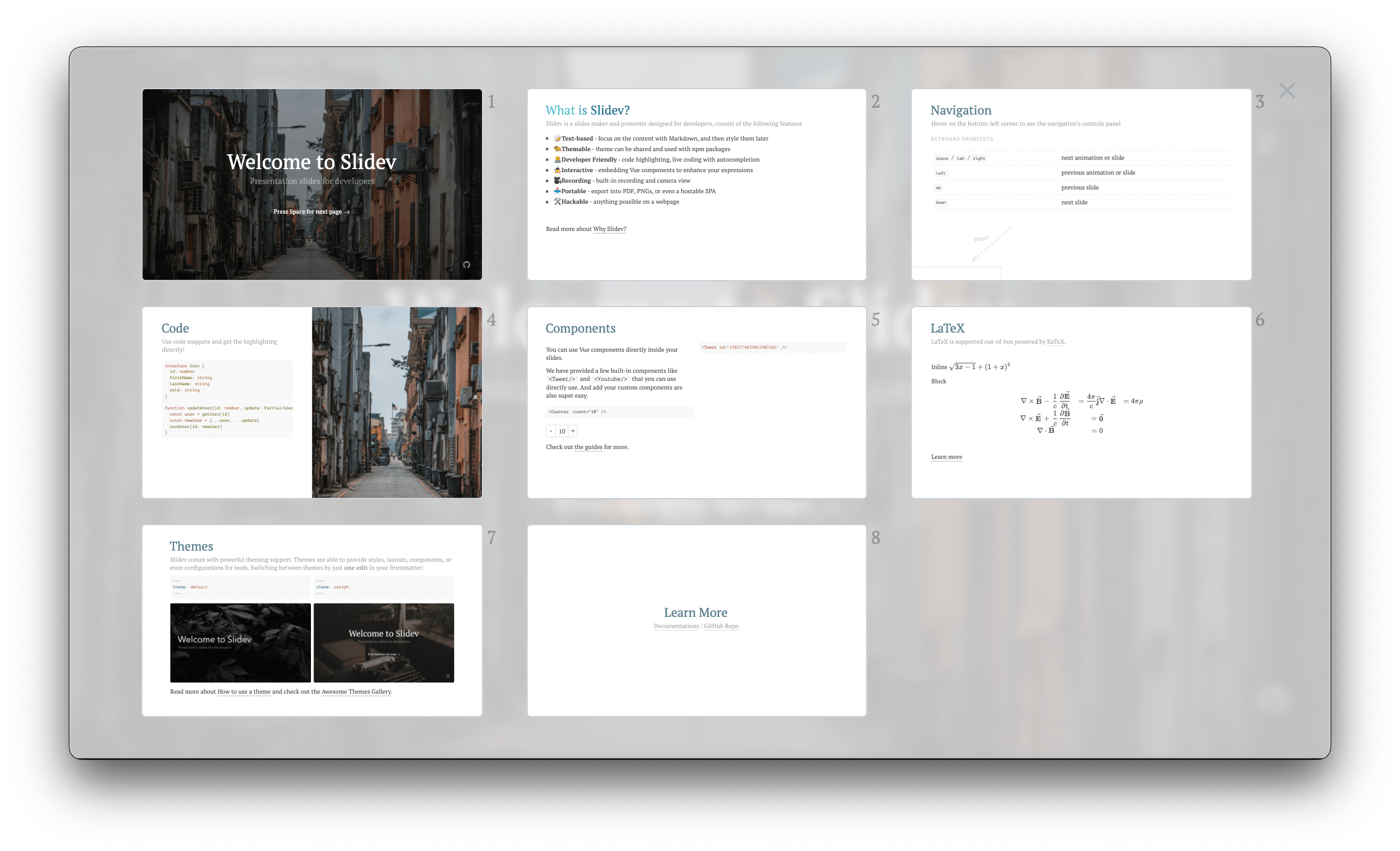 You can visit an overview of all of your slides by first opening the Quick Overview panel and then clicking the on the top right, or by visiting http://localhost:<port>/overview